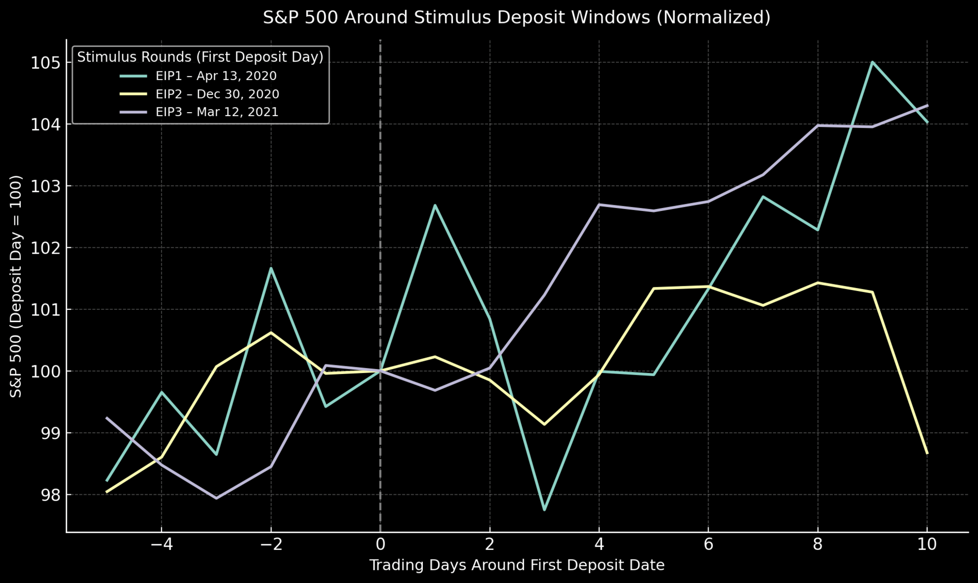 A free option: If a ~$2,000 cash transfer lands, the first week of deposits tends to create a short, sharp “retail-flow” bid in specific corners of the market. In 2020–21, certain stocks (I’ll detail this later) saw ~5–7% abnormal gains right around deposit dates, on top of whatever the broad market was doing. That effect faded fast, and it was weaker by the third round.